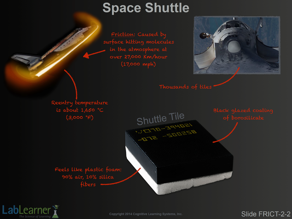 - Remembering that friction is caused by kinetic energy, ask students to consider the enormous amount of energy that the moving Space Shuttle brings to bear on the gas molecules in the atmosphere.
