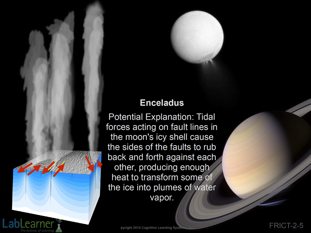 - Explain that this slide illustrates that friction is not limited to our planet Earth. One of Saturn’s moons, Enceladus, has the interesting property of sending large plumes of water vapor into space.