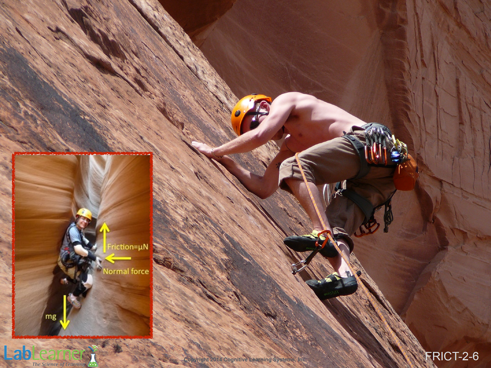 - Explain that the insert photo shows a situation where a climber is taking advantage of a crevasse to scale a rock wall. This technique may be used even when there are no finger or toeholds. Under these circumstances, it is only the force of friction that suspends the climber perhaps hundreds of meters above the ground.