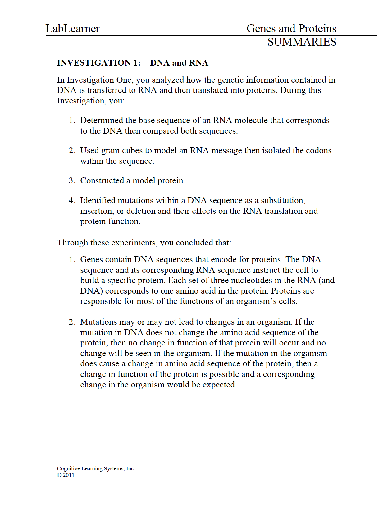 Genes and Proteins: Investigation 1 - DNA and RNA