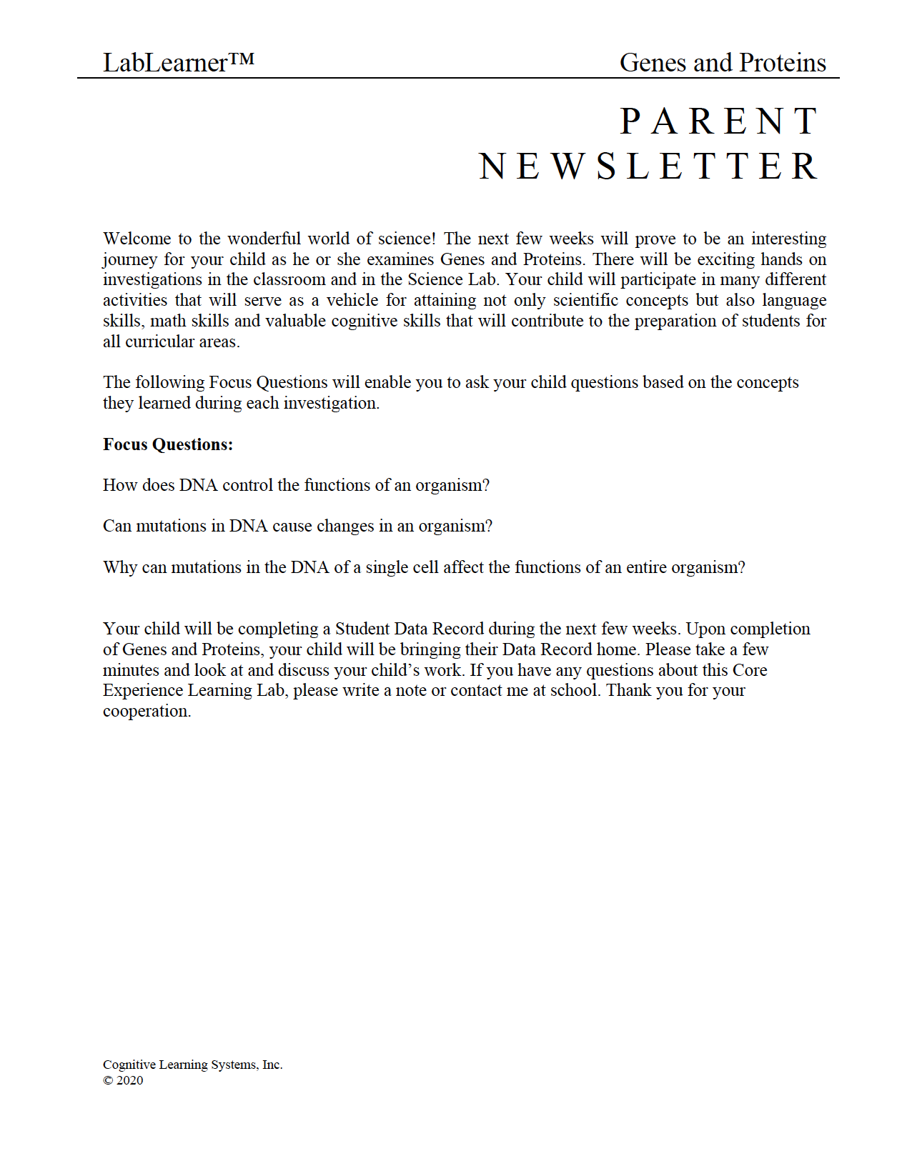 Genes and Proteins: Investigation 3 - Cell Cycle and Transfer of Genetic Information