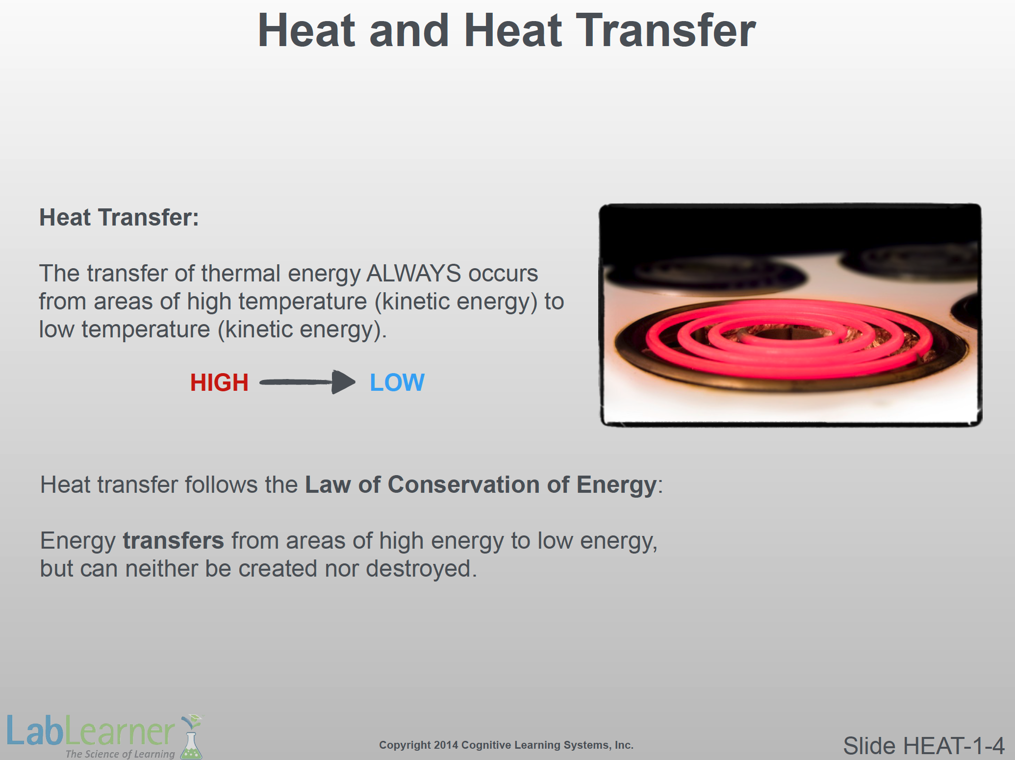 Note: Students sometimes have difficulty with this concept. For example, you may believe that “cold” enters an electric burner when it’s shut off or that “cold” enters your body when they go outside in the winter. Actually, in both cases, the heat/kinetic energy simply moves from areas of higher to lower energy. The burner eventually comes to room temperature so that it is in thermal equilibrium with the air in the room and no net energy transfer occurs. If this happens to our bodies outside, we freeze to death! It’s that simple.
