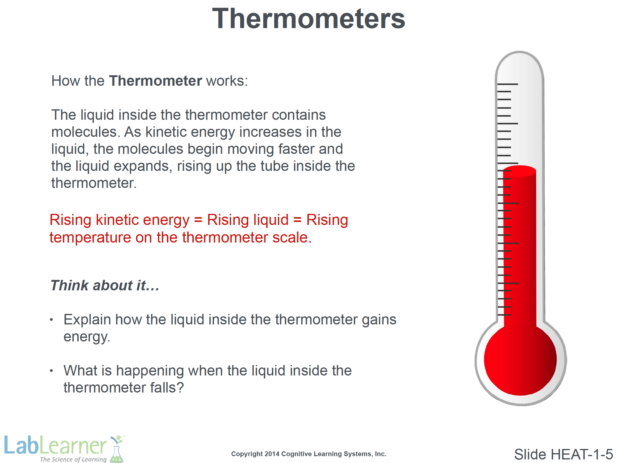 Note: In this Investigation, you will learn that thermometers work by increased kinetic energy and the consequent expansion of the sealed fluid that results.