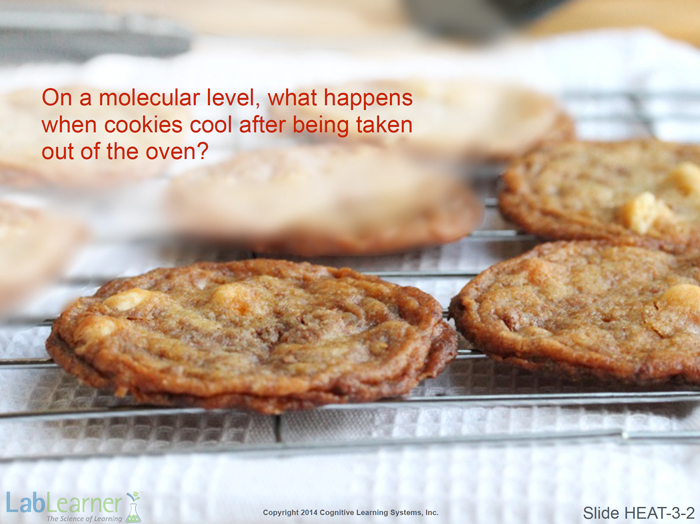 Note: IT IS ESSENTIAL that students do not conclude from this discussion that the actual cookie molecules leave the cookie and enter the kitchen air! Just as in the case when a thermometer was placed in hot water in Investigation 1 and kinetic energy was transferred to the glass and then into the fluid inside the thermometer, it is a transfer of energy, not molecules. The molecules in the hot cookie are shown to move fast because of high levels of kinetic energy. When the kinetic energy leaves the cookie and enters the kitchen air, the cookie molecules slow down. They are still in the cookie.