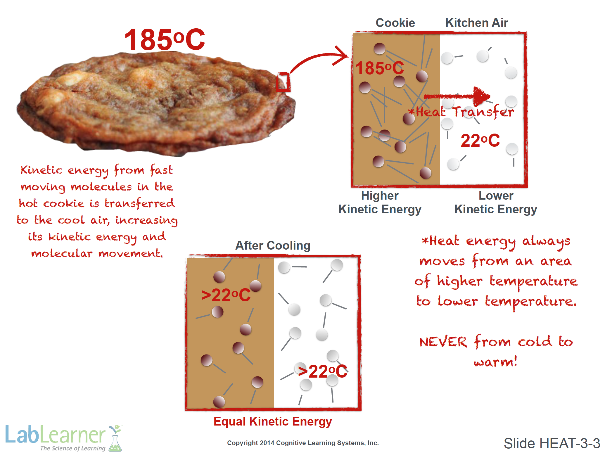 - Explain that heat energy is transferred from the cookie to the air, from the direction from higher to lower kinetic energy.