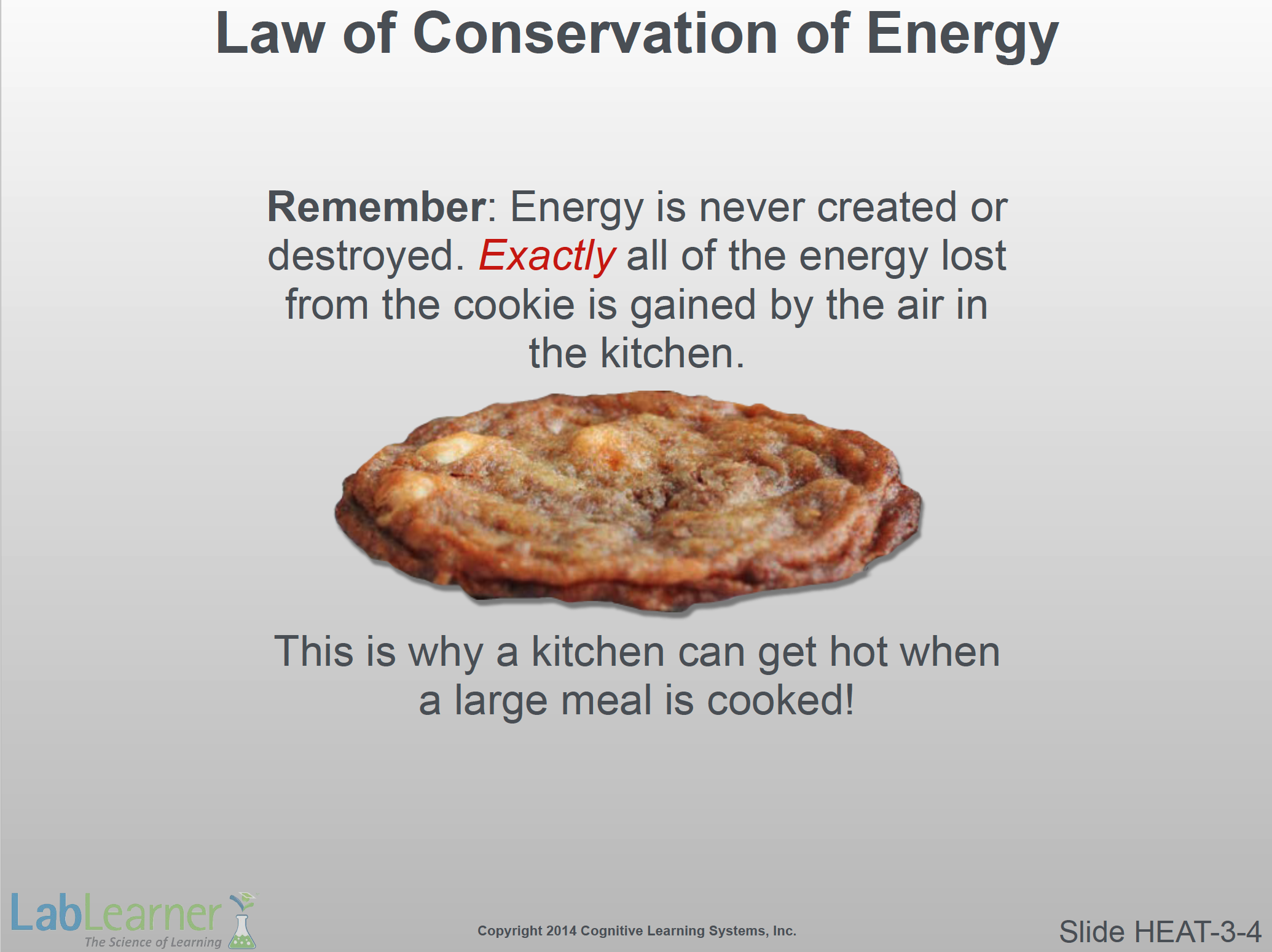 - Remind students of the Law of Conservation of Energy, which states that energy cannot be destroyed or created. Therefore, all of the excess heat and energy from the cookie MUST be transferred to the air in the kitchen.