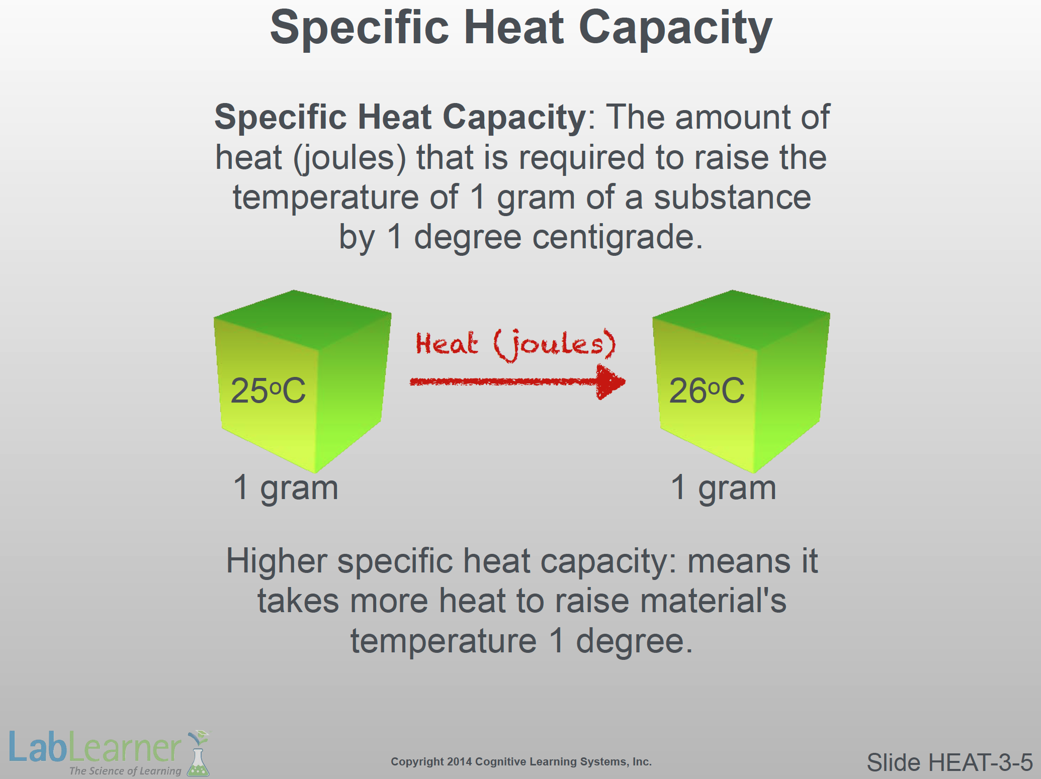 Note: In this slide, the temperature of a 1 gram cube is shown to increase from 25oC to 26oC. The amount of heat (in Joules) required to do this would be this substance’s specific heat capacity.