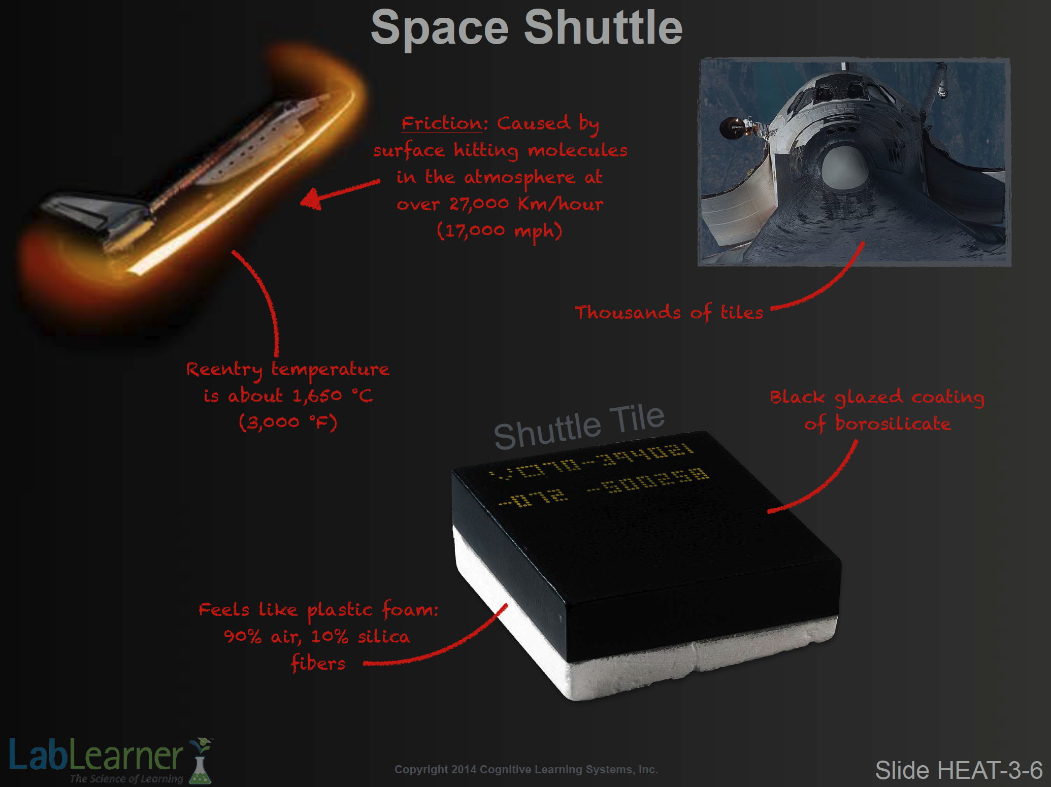- Explain to students that the three main components of the tiles, air, boron, and the silicon all have relatively high specific heat capacities. Thus, these relatively thin tiles are able to keep the skin of the Shuttle at somewhere around 300+oC, even though only a few centimeters away the temperature is over 1,600oC. Amazing!