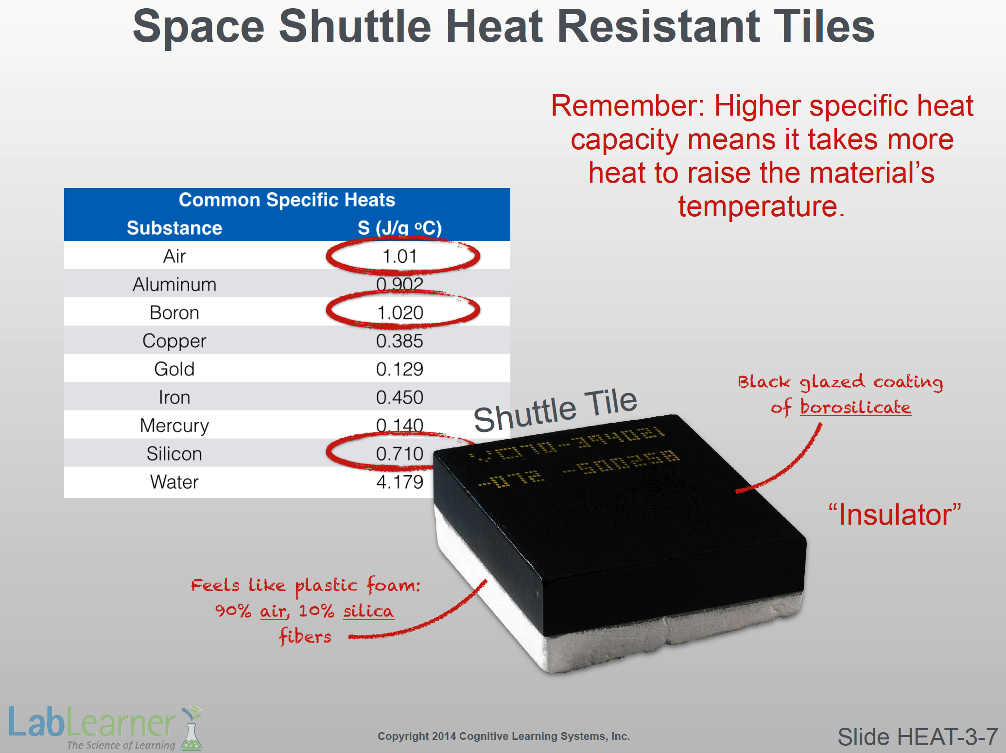 - Inform students that this slide shows the specific heat capacities of a number of substances including materials that go into the manufacture of the Shuttle heat tiles.