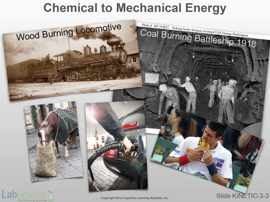 - Clockwise from top left, an old steam locomotive used wooden logs (loaded in the second car) to boil water and drive the steam engine. In a similar manner, the coal-burning navel vessel, the USS George Washington, was powered by steam. The “firemen” stoked the boilers to maintain steam pressure to drive the engine. To the lower right, international tennis star Novak Djokovic consumes a banana for energy and potassium during a match. Bottom center, gasoline is added to fuel an internal combustion engine. Bottom left, a horse feeds on hay to obtain chemical potential energy to pull a cart.