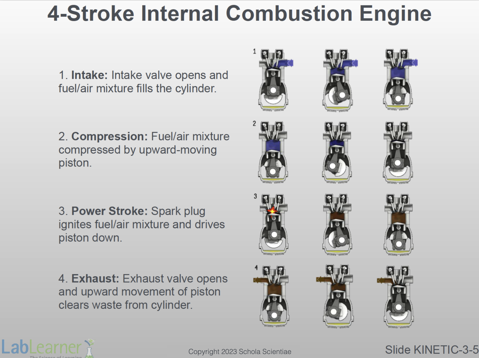 - This slide shows the cycle of a 4-stroke internal combustion engine.