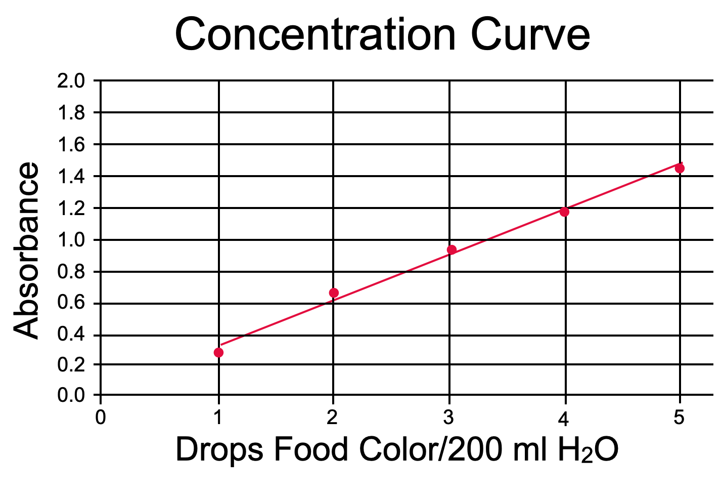 - Study the concentration curve. What is the concentration of food coloring in the unknown sample? Approximately 2 drops of food coloring per 200 ml water.