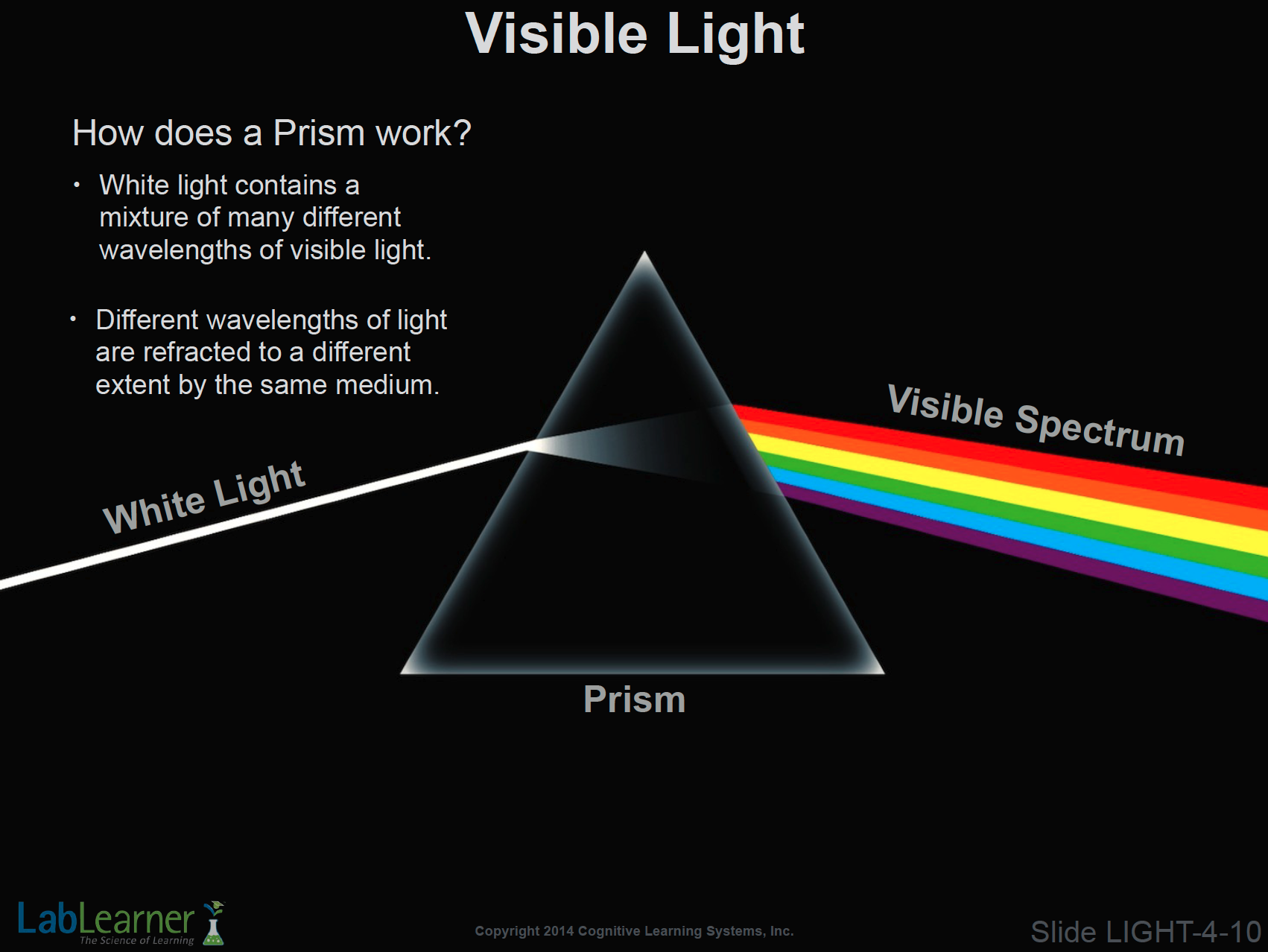 • This slide shows how a prism uses the principle of refraction to separate the mixed waves in white light into its separate component wavelengths.