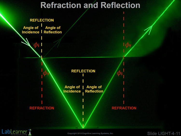 • The third animation reveals the reflection event at the bottom of the tank where the laser beam strikes a mirror. Notice that the angle of incidence and the angle of reflection are equal as discussed in Investigation 2.