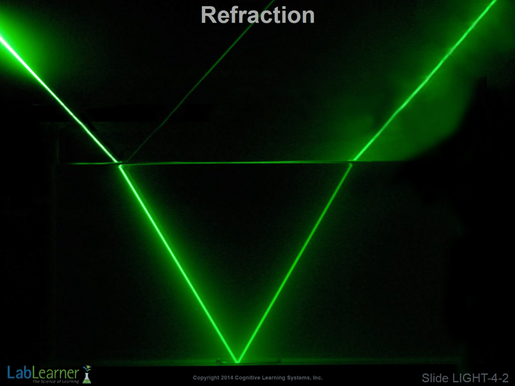 • We will end the presentation by returning to this slide and identifying the different examples of both refraction and reflection that occurs in it. At this point, it can simply be said that refraction bends light as seen where the laser interacts at the air/liquid interface.