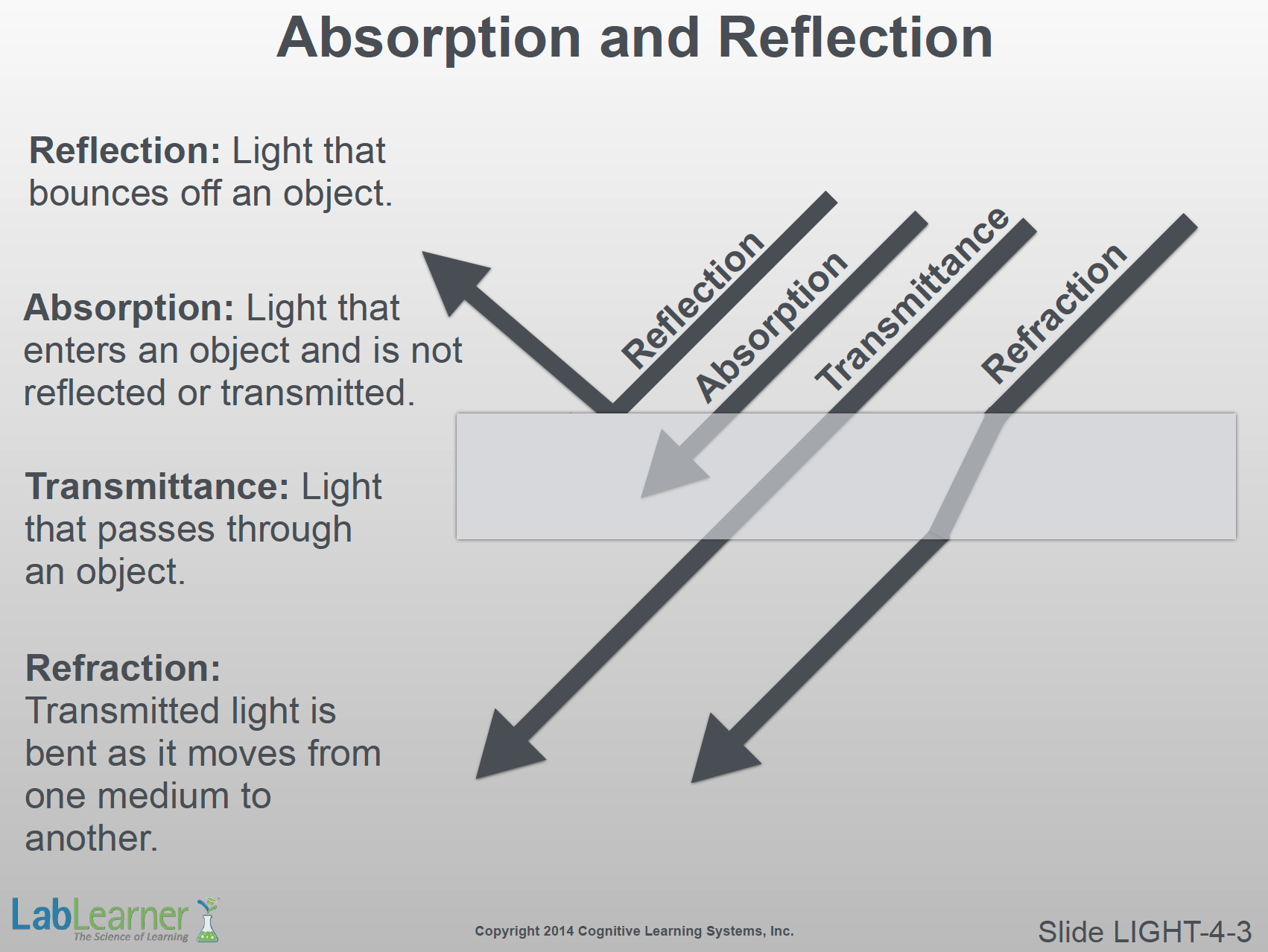 • This slide is similar to ones used in previous Investigations in this CELL. It serves as a review of the concepts of reflection, absorption, and transmittance. In addition, it introduces the concept of light refraction.