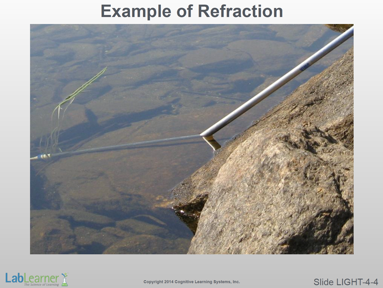 • This slide shows a very good example of refraction in everyday life. In this case, the two mediums that light travels through are air and water. Notice that solid objects, when they reflect light to our eyes through different media, exhibit refraction. Students should keep this in mind during this Investigation because we will study refraction by observing actual light beams being refracted rather than light being reflected from objects.