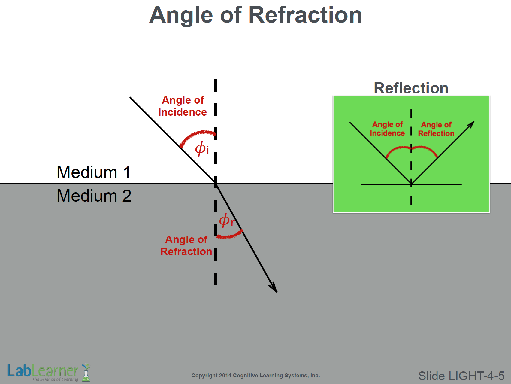 • In this slide we see light being refracted as it moves from Medium 1 into Medium 2. Notice that the beam of light is bent at the interface. To determine the extent or degree of bending, a perpendicular dashed line is drawn. The angle of incidence is the angle between the light beam in Medium 1 and the perpendicular line. Notice that the angle of incidence for refraction and reflection (green box) are essentially the same. It is the angle at which the light beam strikes the surface.