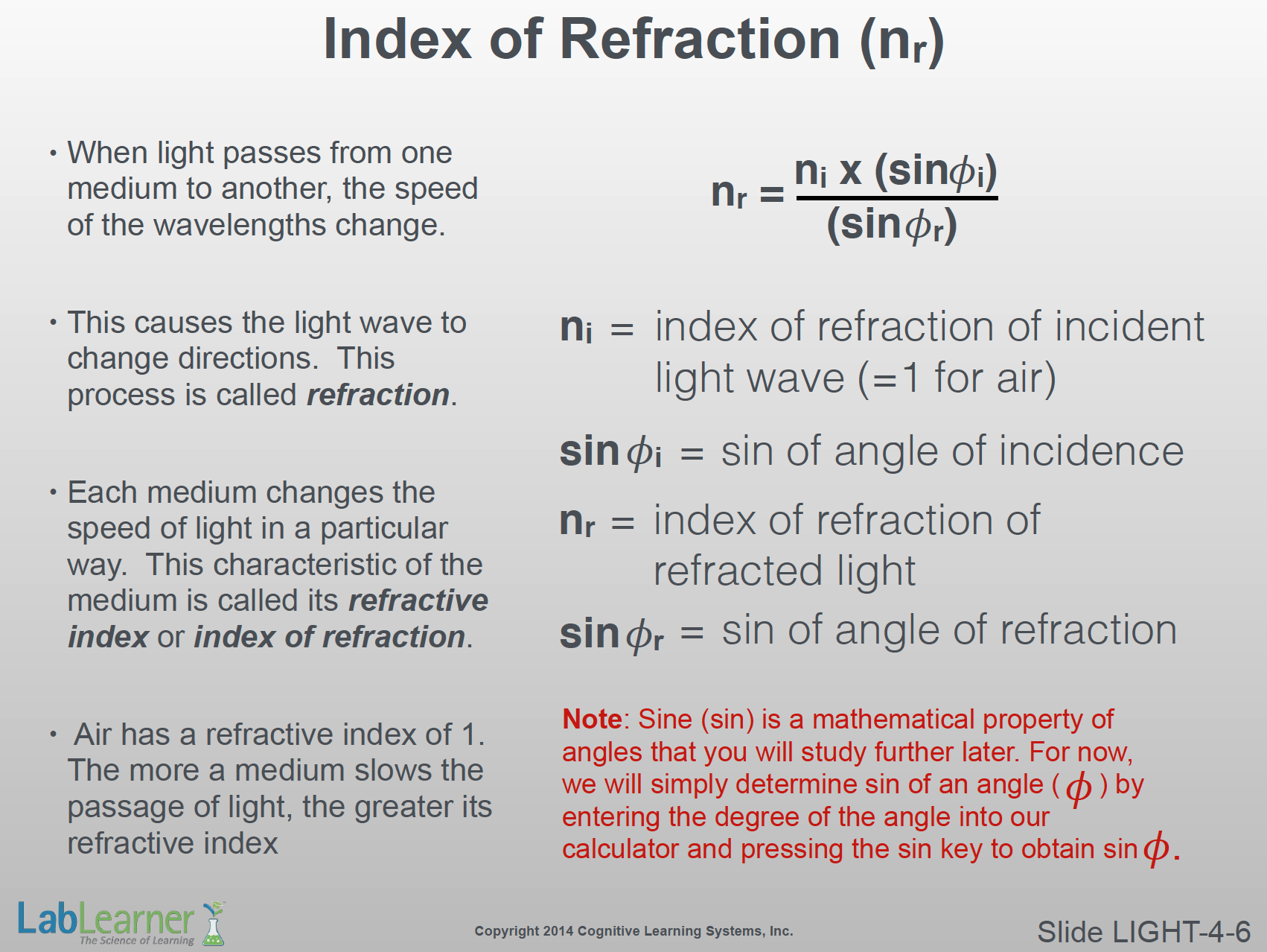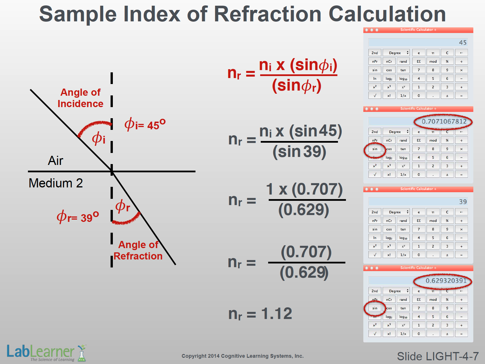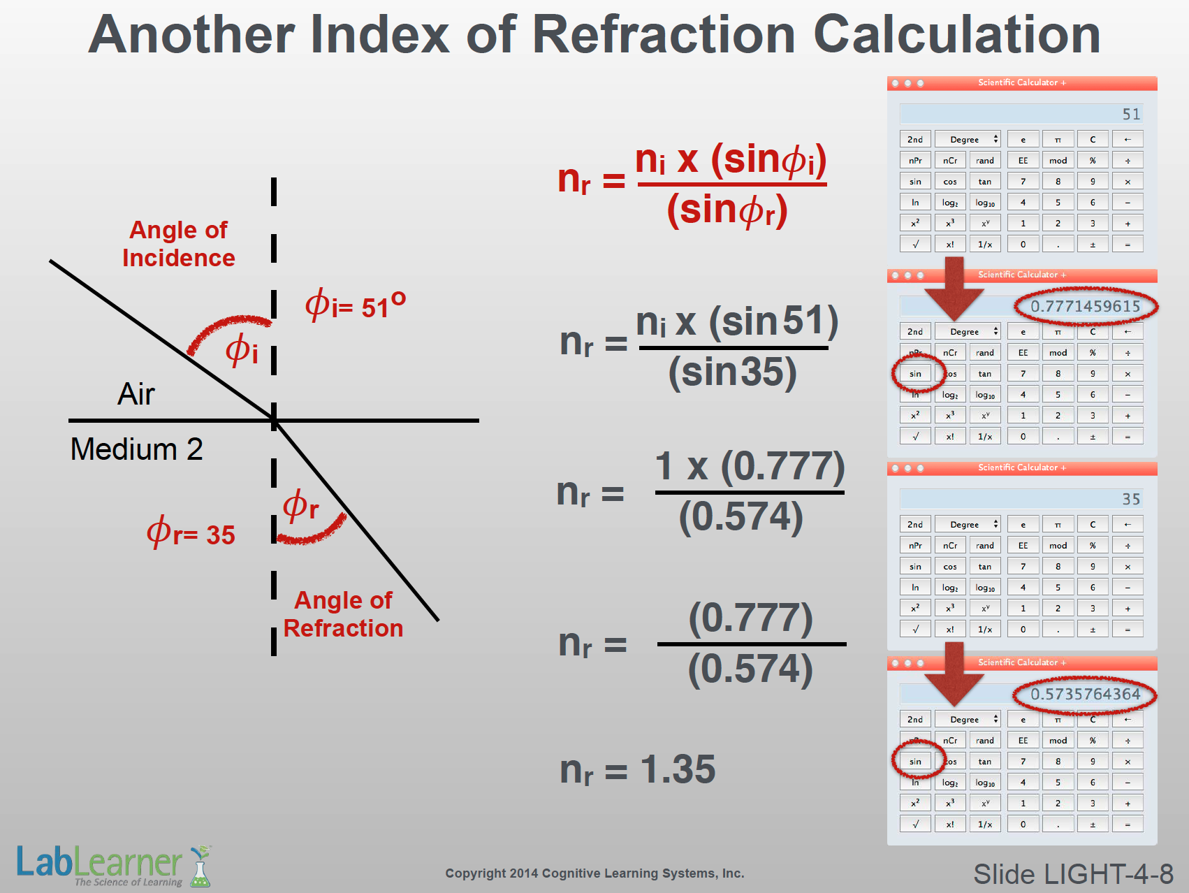 • Walking through this formula using the steps on the slide should be done with an eye on its simplicity. In all our calculations, for example, ni will always be 1 as this is the index of refraction of air. Phi is simply used instead of the word “angle” and sine (or sin) is only a keystroke on a calculator.