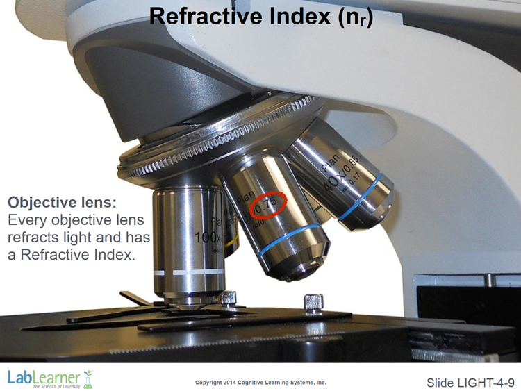 • This slide shows a close-up of the objective lenses of a microscope similar to those in the LabLearner lab. Since glass lenses refract light, the refractive index of all objective lenses is always stamped on them for reference. Students may wish to confirm this when in the lab.