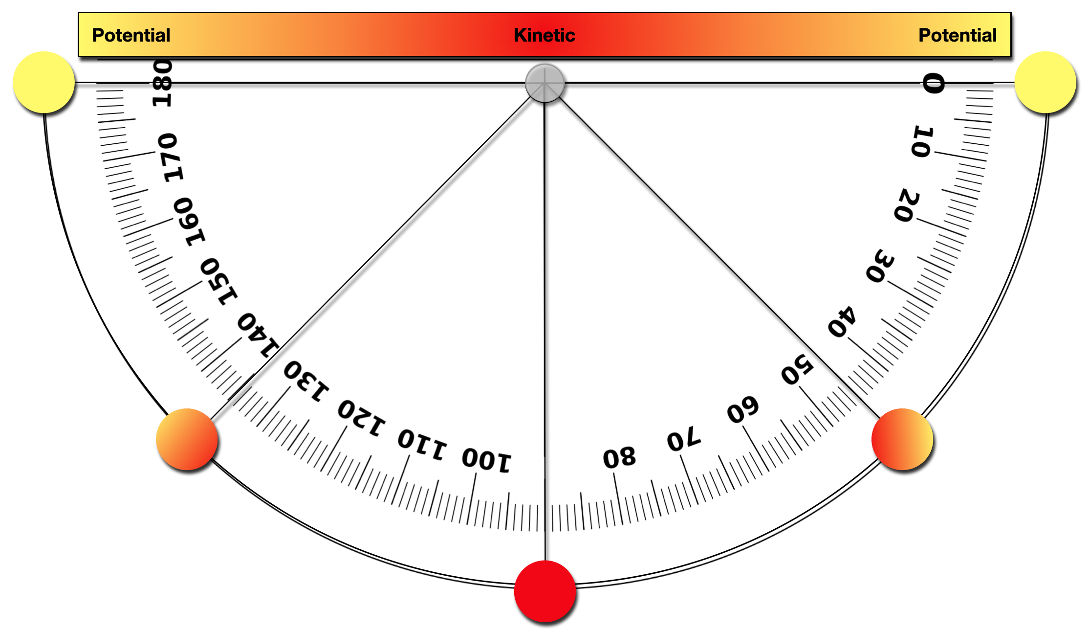 When the pendulum bob is positioned at its extreme amplitude, that is the angle between the string at the vertical position just prior to its release, the bob is not moving and all of its energy is in the form of potential energy (indicated in yellow in the figure here). Once released, gravity acts on the mass, causing it to fall toward the vertical position. At the bottom of the pendulum swing, at the vertical position just prior to its continued movement beyond this point, 100% of the energy present is in the form of kinetic energy (indicated in red in the figure) – the energy of motion. Importantly, as shown in this Figure, as the bob swings to the vertical position, the loss of potential energy is exactly in proportion to the gain in kinetic energy (changing from yellow to red in the figure). That is, at some point in the downward swing, exactly 50% of the total energy will be in the form of potential energy and 50% will be in the form of kinetic energy. Thus, since the total energy in the system is the same at any point in the swing, this simple experiment nicely illustrates Newton’s Law of Conservation of Energy which states that energy can not be destroyed or created, but simply changes forms.