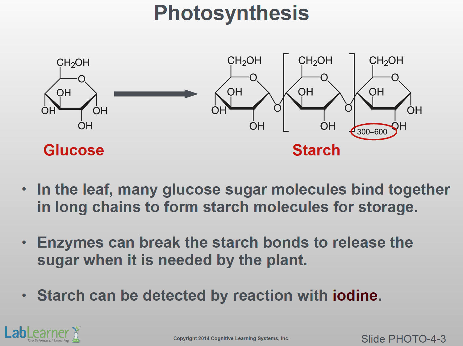 - This slide shows that the glucose molecules produced in plants by photosynthesis are stored in the leaf not as the sugar itself, but as a “polymer” of glucose molecules know as starch.