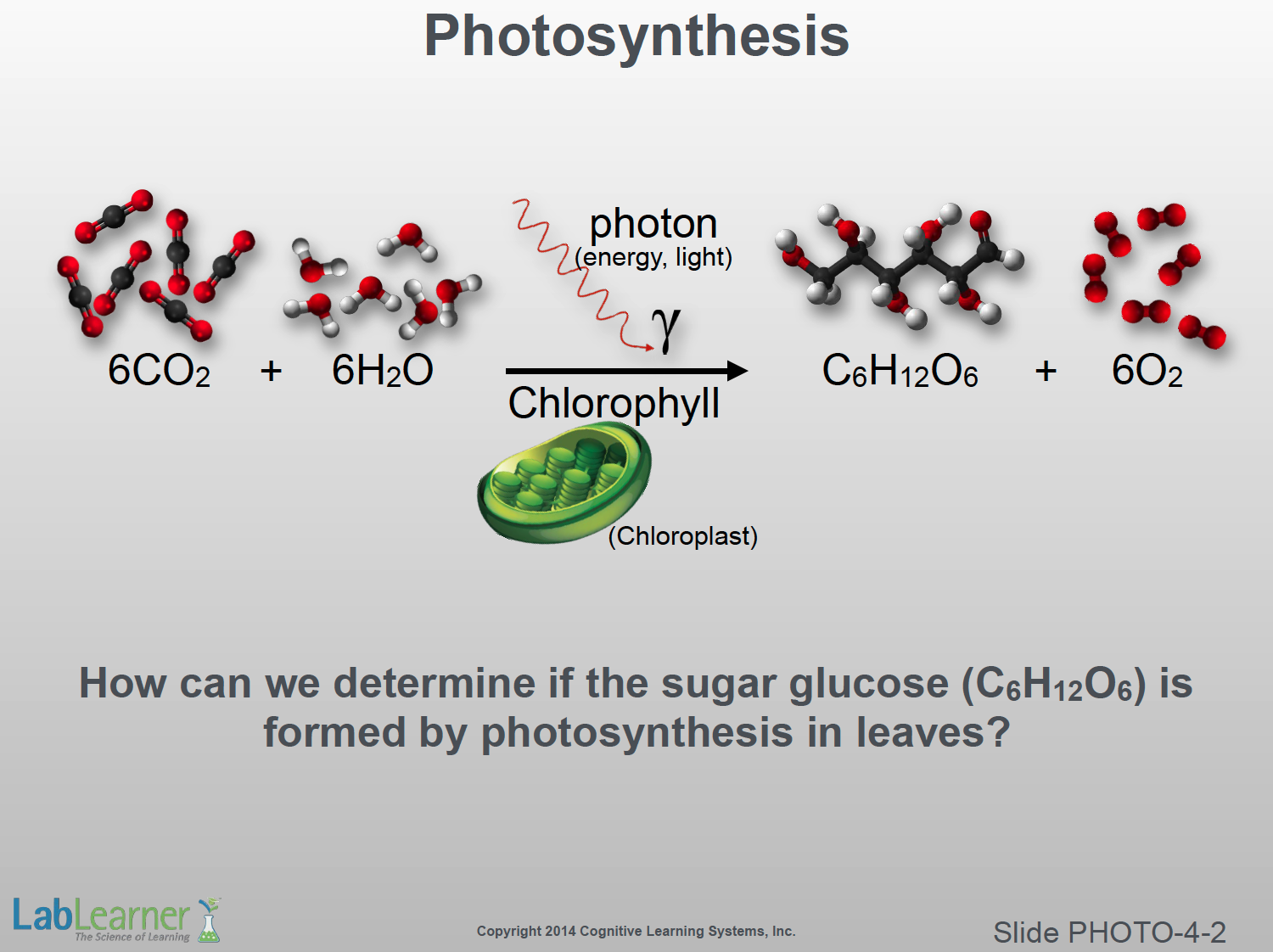 - This is a review slide that asks the important question “How can we determine if the sugar glucose (C6H12O6) is formed by photosynthesis?” Glucose is the only component of the photosynthesis reaction that we have yet to consider.
