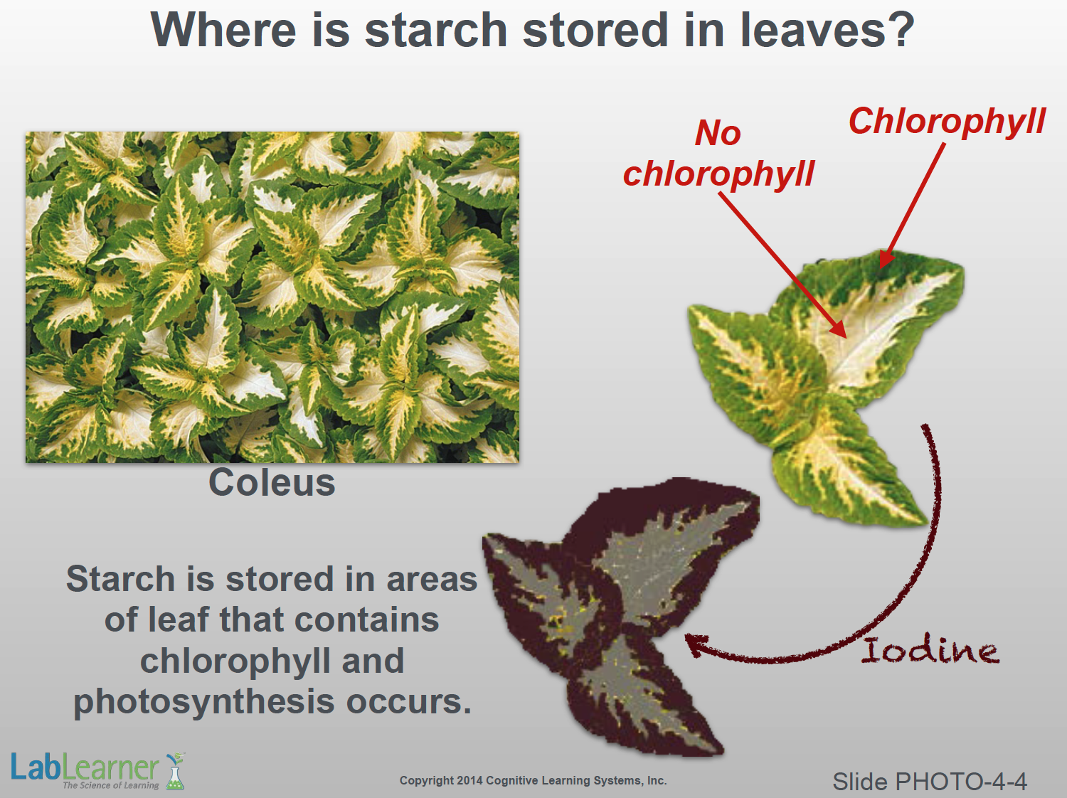 - Finally, the last bullet on this slide states that starch molecules can be detected by reaction with iodine. In Investigation 4 lab, students will use iodine staining to localize the distribution of stored starch in the leaf of the Coleus plant.