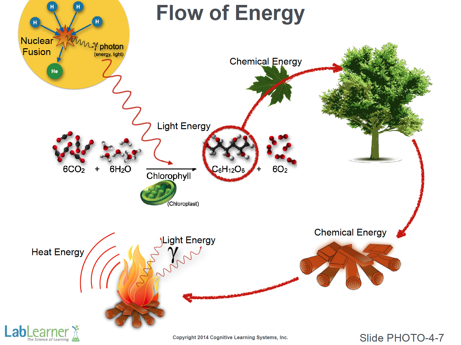 - Finally, at the lower left, when wood is burned in the “combustion” reaction of fire, the bonds storing potential chemical energy from the tree are broken and the potential chemical energy is converted and released as the kinetic energy of light (photons) as well as kinetic radiant energy (heat).