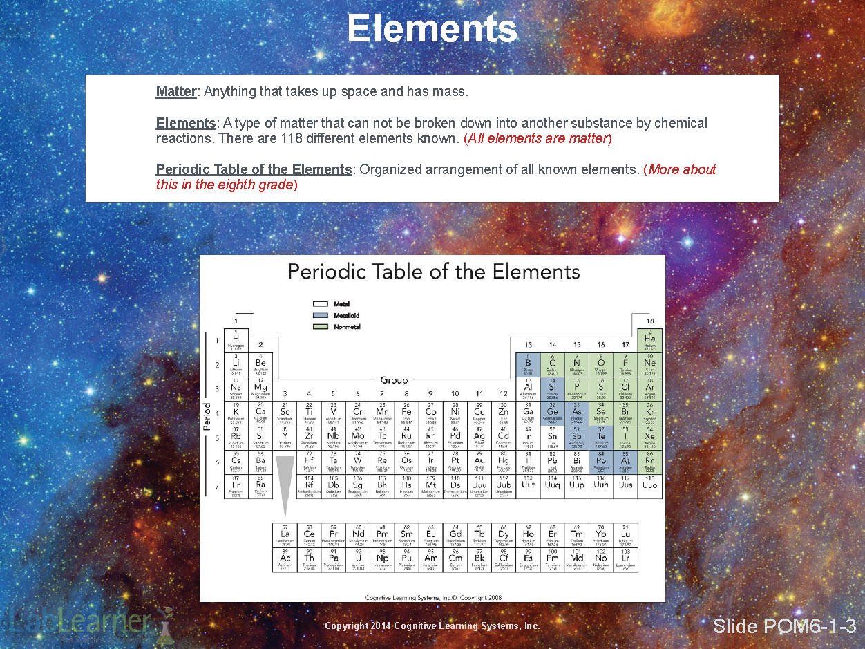 Note: Students are not expected to know the terms protons, neutrons, and electrons in this CELL. They are placed here for enrichment purposes and to help students understand the hierarchy of matter.