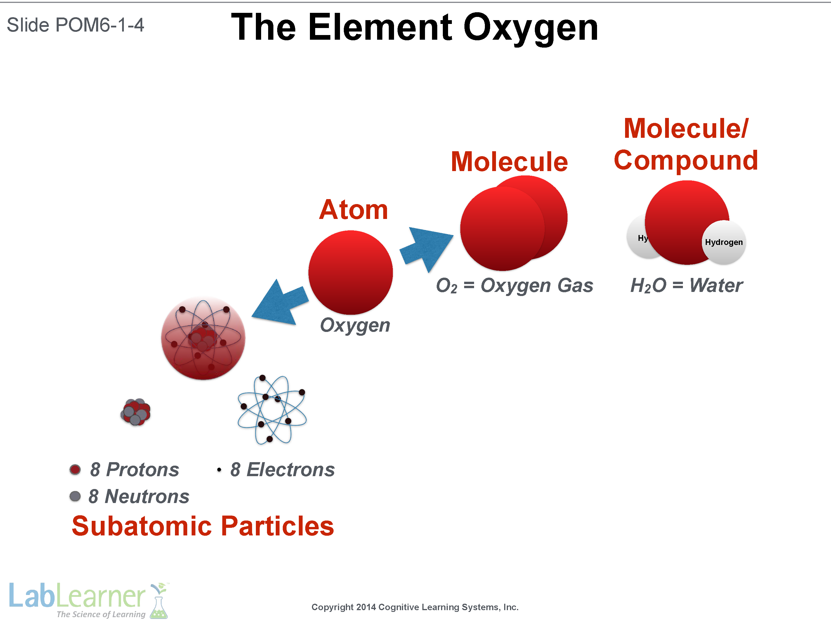 - Explain to students that elements, such as oxygen, are composed of smaller, subatomic particles called protons, neutrons, and electrons.
