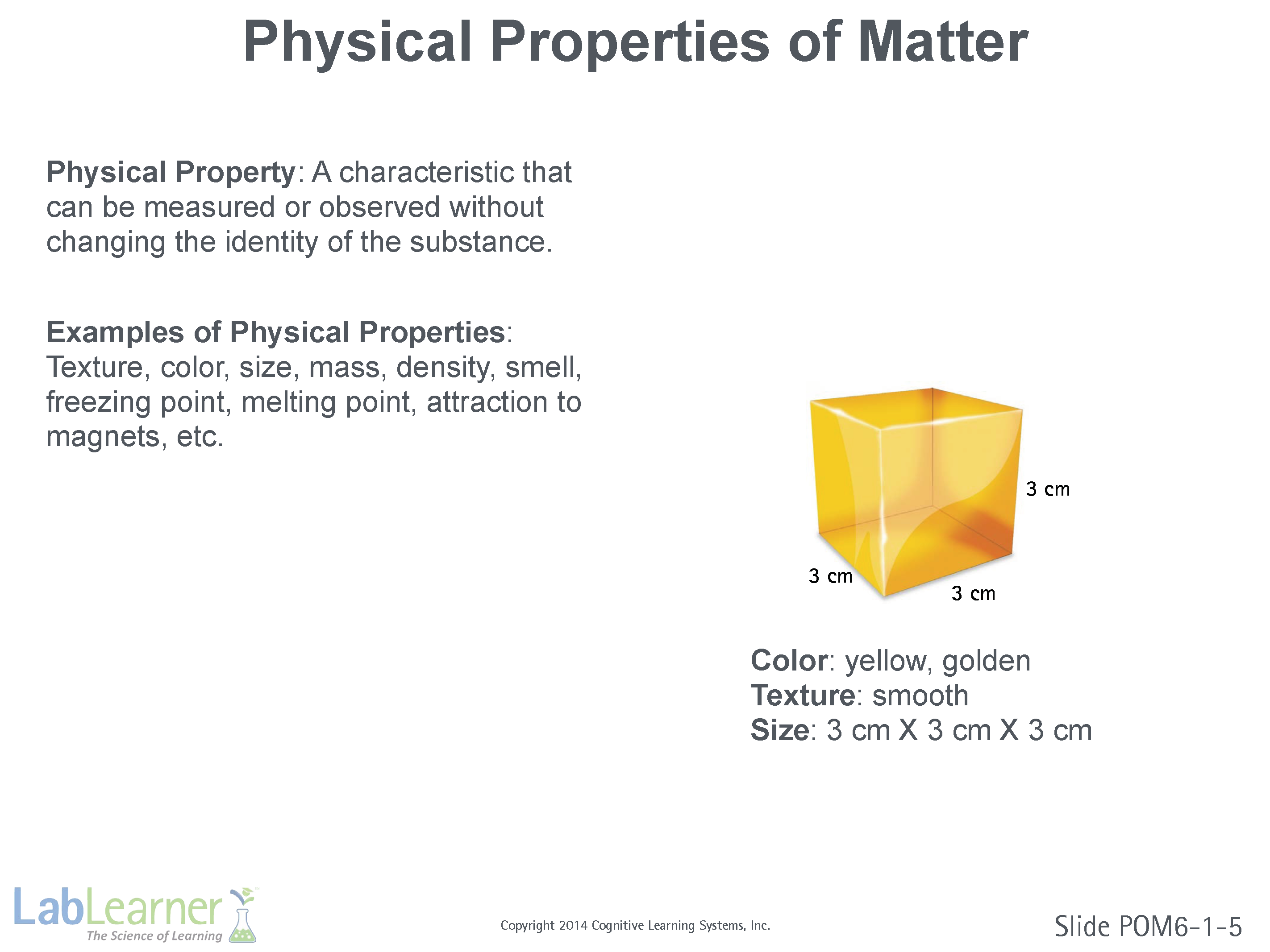 - Point out that the cube on the right is shown with a few physical properties one might list to describe it.