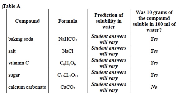 a. Locate the formulas in Table A. Make a prediction: Which solids do you think will be soluble in water?