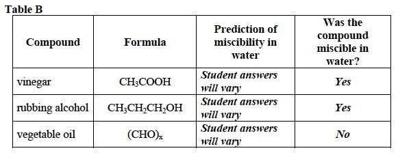 b. Make a prediction: Which liquids do you think will be able to mix (miscible) in water?