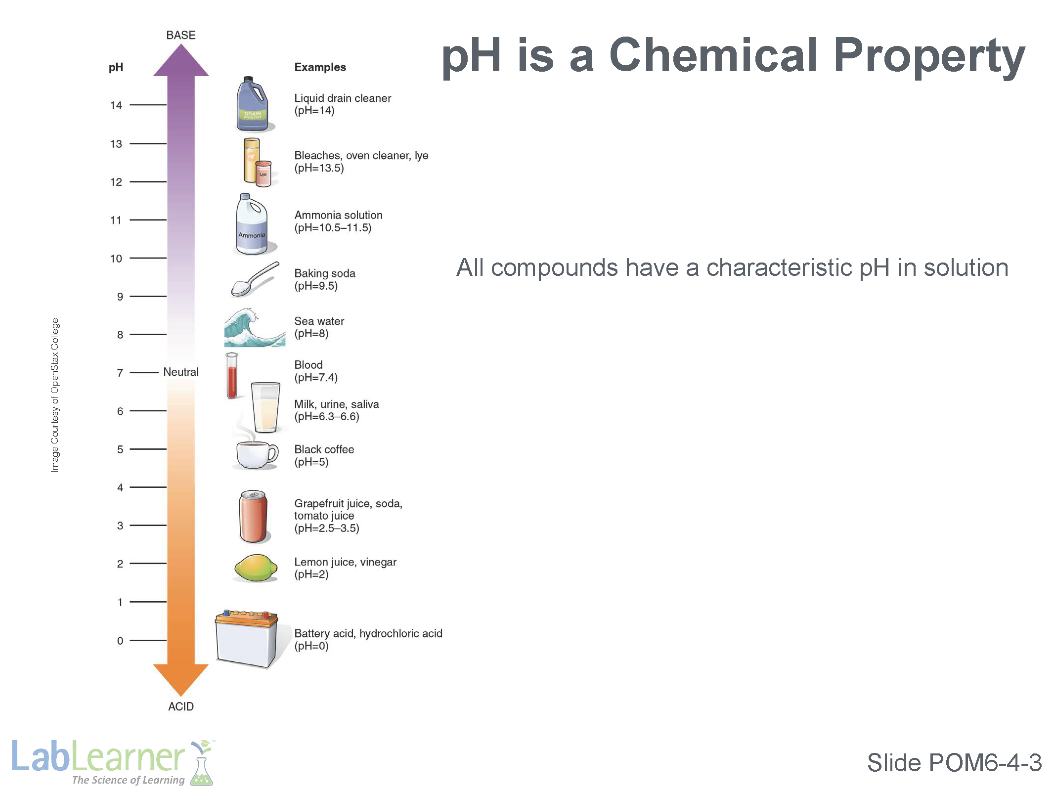 - Tell students that this slide depicts the pH Scale and highlights the pH of a number of common compounds that may be familiar with.