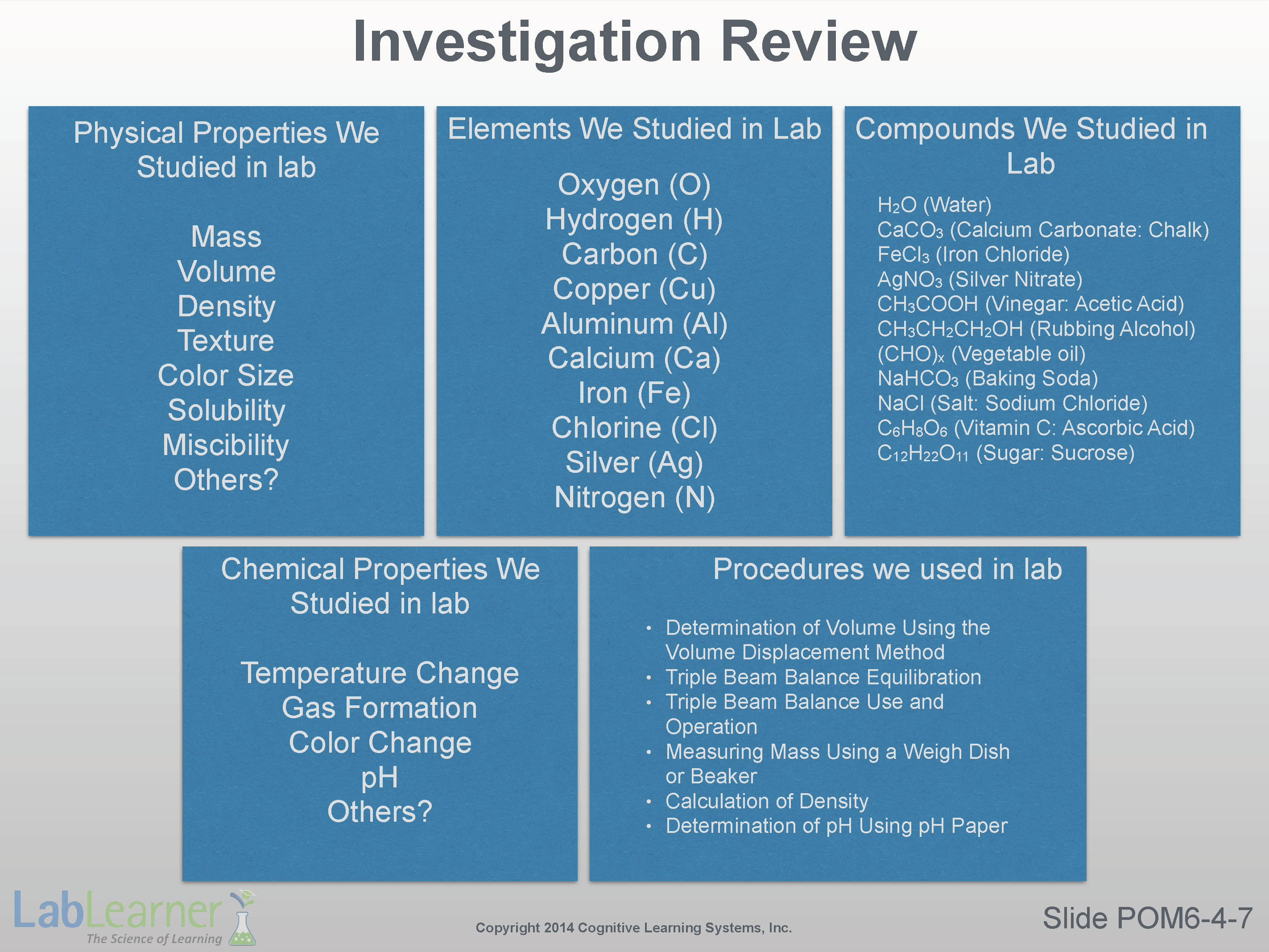 Note: If time permits, this final slide lists some of the highlights of the CELL Properties of Matter for grade 6. It can serve as a background for any number of discussions at the end of this CELL or as a review at a later time.