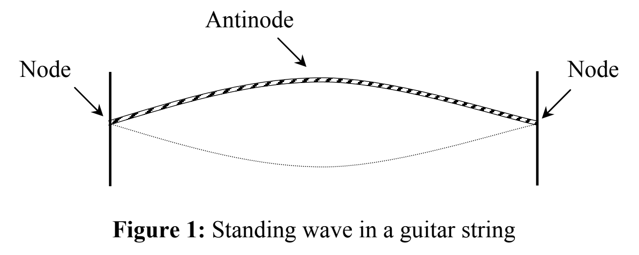 The string is in constant, non-random motion. The motion of the standing wave is invariant and repeated so rapidly that the wave appears to be “standing” still. The full motion of the string occurs in the center and is termed an antinode. The ends where the string does not move are termed nodes. At least two additional standing waves occur in a guitar string and most vibrating matter. These standing waves have two and three antinodes that result in overtones or harmonics.