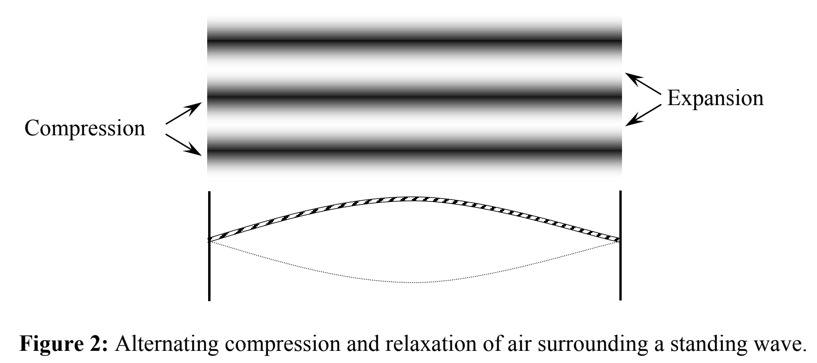 The vibration of a standing wave causes surrounding matter to be displaced in waves that move away from the standing wave. These longitudinal waves take the form of pressure waves since the vibration of a standing wave alternately causes surrounding matter to be compressed and expanded. Again, this is most easily understood using the example of a guitar string. The standing wave of the vibrating string alternately compresses the gas molecules in the surrounding air and allows the molecules to expand. Every time the antinode of the standing wave is at its greatest deflection at the top of its motion, the molecules on that side of the string are compressed into a smaller volume. Every time the antinode is at its greatest opposite deflection at the bottom of its motion, the molecules on that side of the string are allowed to expand into a larger volume.