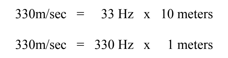 For example, the speed of sound in air is approximately 330 m/sec. A sound with a frequency of 33 Hz, just above the threshold of human hearing would have a wavelength of 10 meters. A sound with a frequency of 330 Hz, a frequency within the C scale, would have a wavelength of 1 meter.