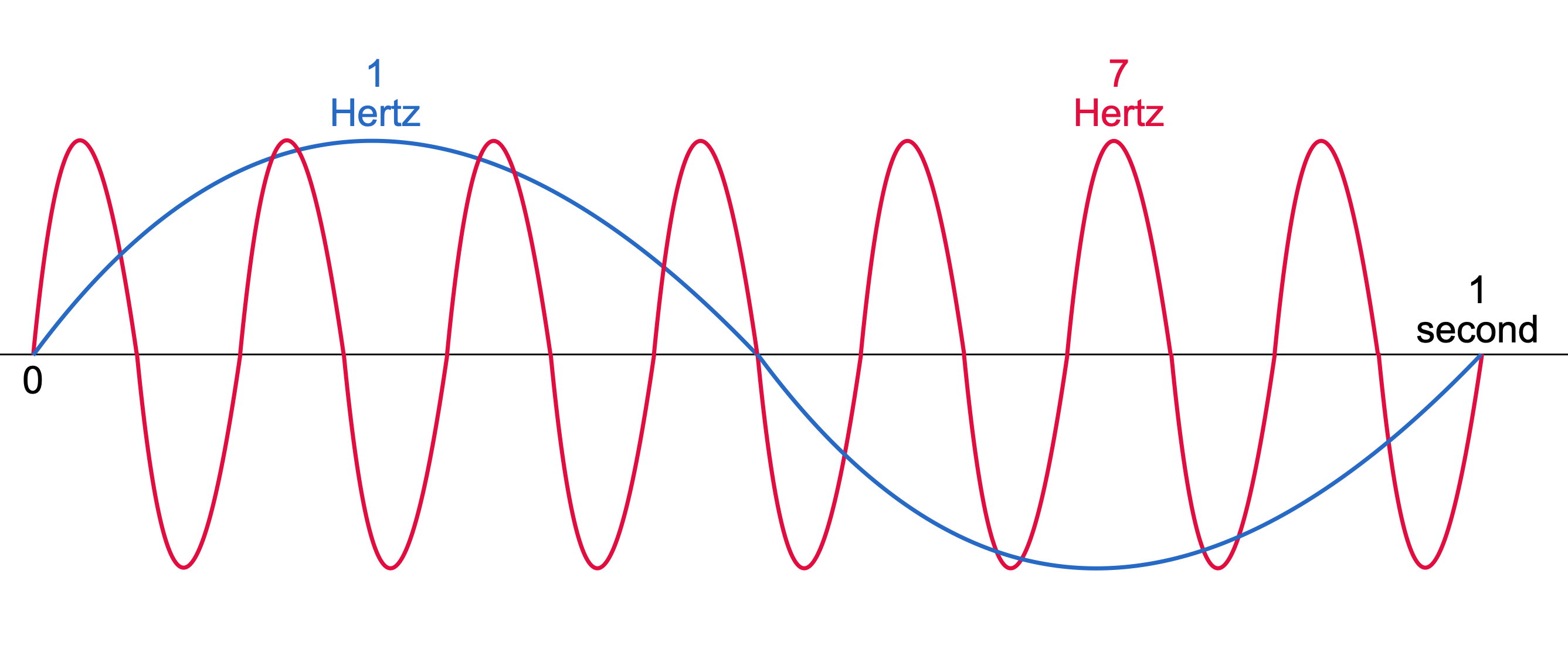 Heinrich Hertz was a German scientist who’s short life lasted from 1857 to 1894. In honor of the accomplishments the international unit of frequency was named after him (the Hertz). For our purposes, a Hertz is the number of cycles per second of a sound wave. The figure below depicts a 1 Hertz and a 7 Hertz sound wave. Notice how the 7 Hertz wave has 7 cycles in the 1 second shown on the graph.