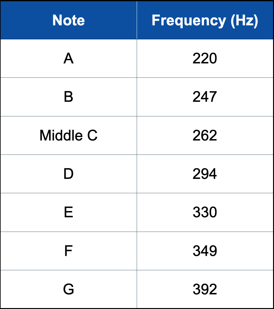 Below is a table showing the seven notes of the musical scale around the piano middle C (~262 Hz).