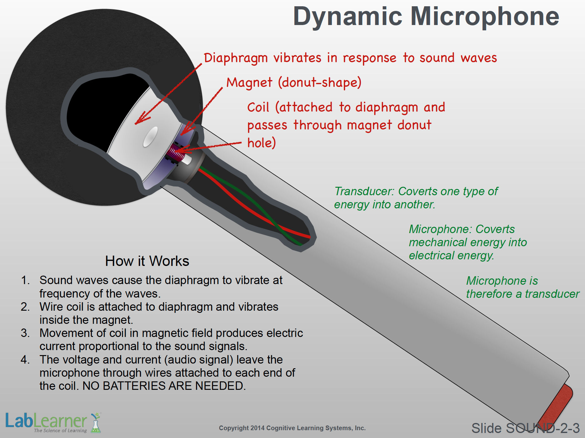 - This slide shows how a microphone works. This is a specific kind of microphone know as a dynamic microphone. It is the type of microphone most commonly used on stage and in concepts.