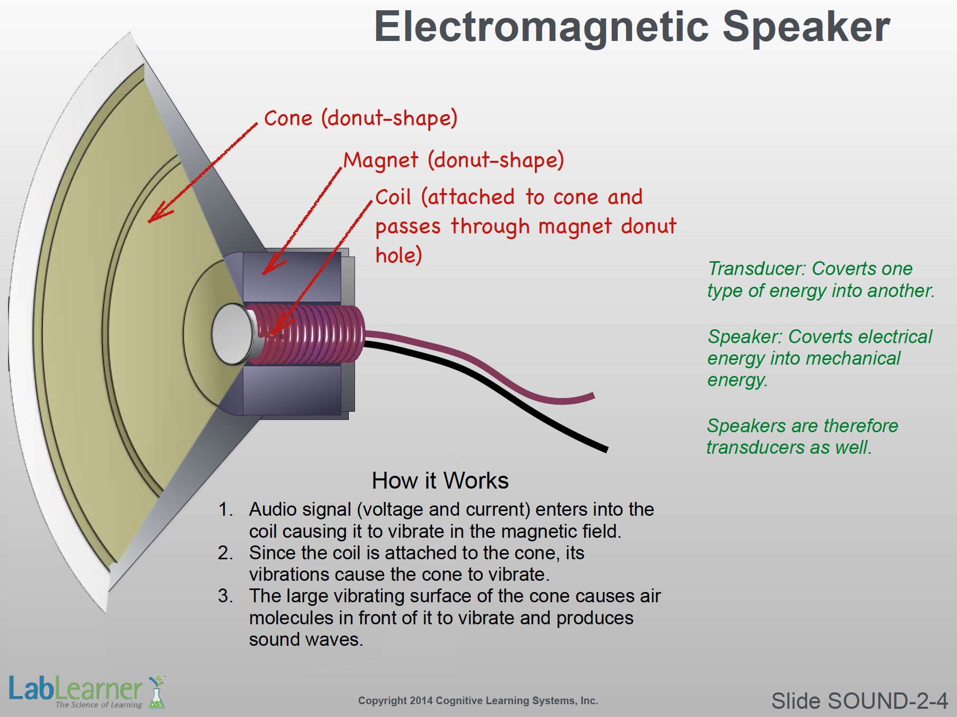 - Thus, as shown in green text, a speaker is also a transducer. It converts electrical energy from the audio signal to the mechanical energy of sound waves – the opposite of what the microphone does.