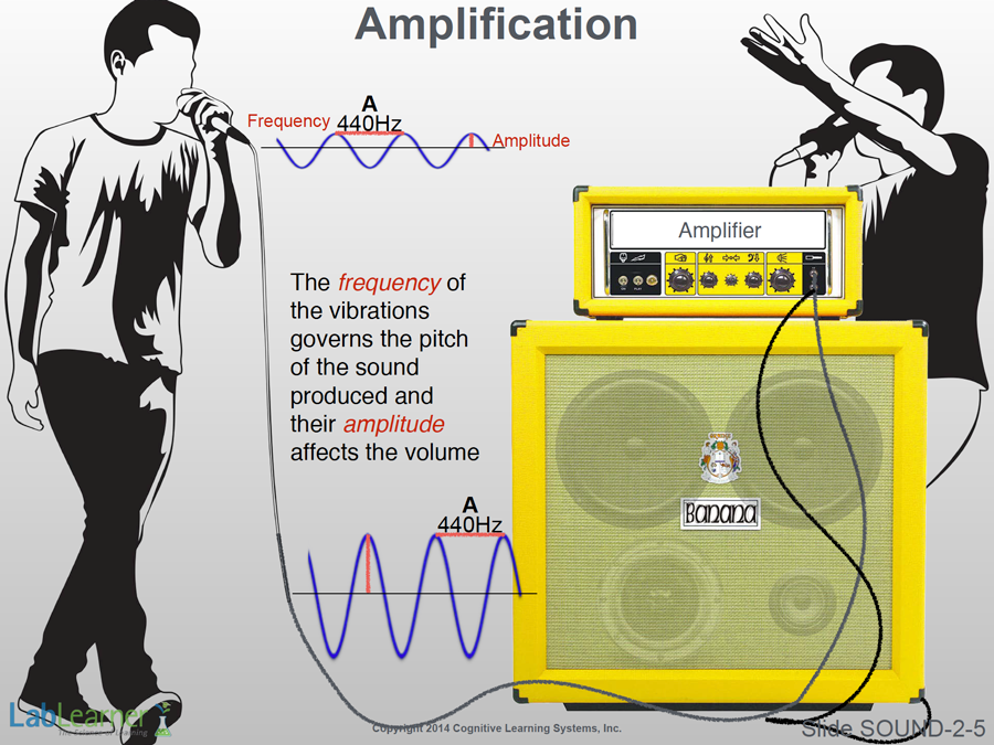 - The A-note (440Hz) signal leaves the amplifier with higher voltage and energy and reaches the speakers (see the bottom wave graph to the left of the speakers). Notice that while the frequency is identical to that of the audio signal, the amplitude has increased. It is this increase in amplitude that an amplifier causes and is responsible for all the loud noise at a rock concert.