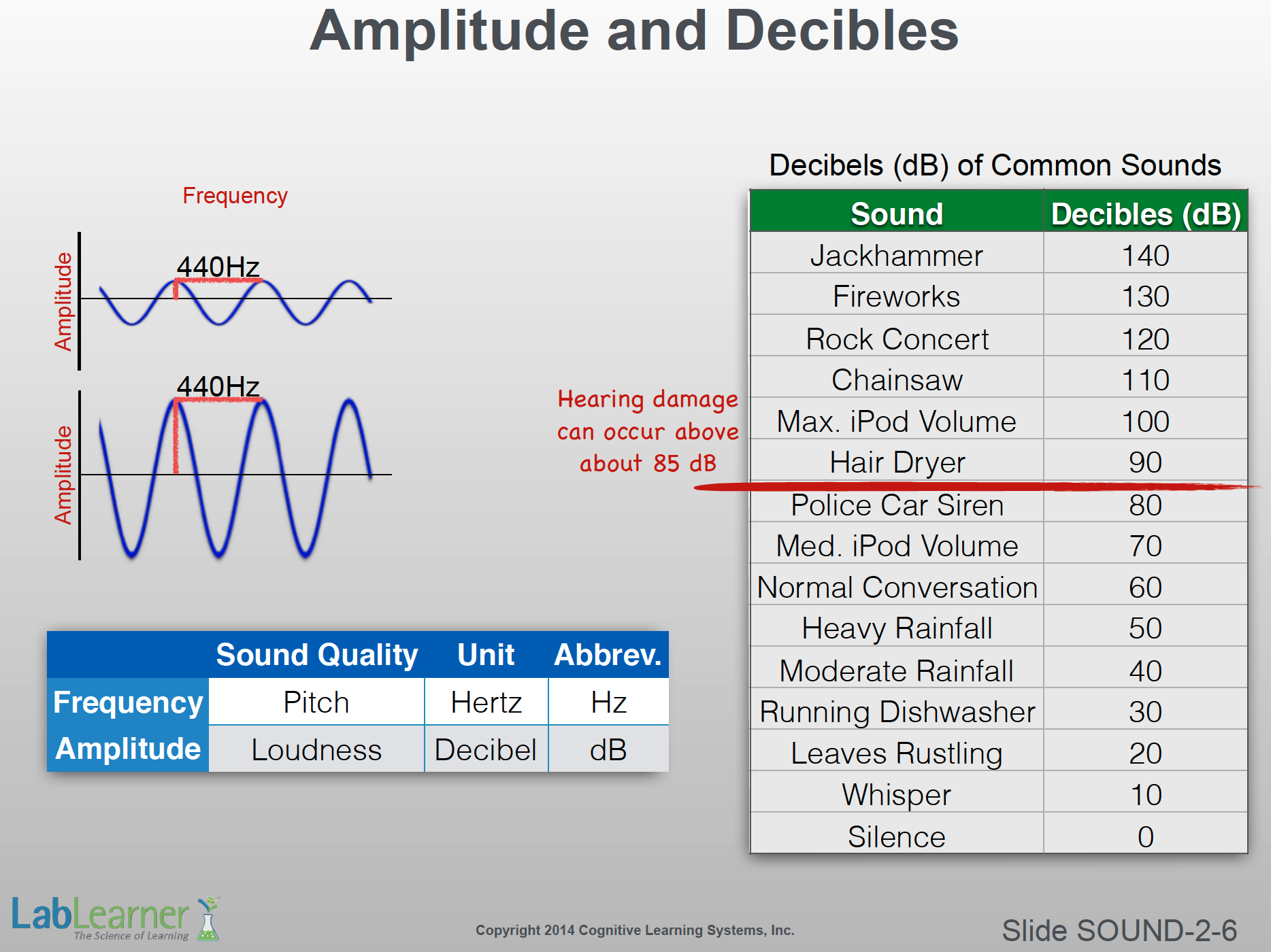 - On the right of this slide is a chart showing common sounds that occur at various decibel levels. Sounds grow louder and louder as we move up the chart. Notice that damage to the human ear can begin at about 85 dB and up. Nonetheless, we may well encounter some of the sounds above this level. Limiting exposer and wearing ear protection will minimize damage to our ears.