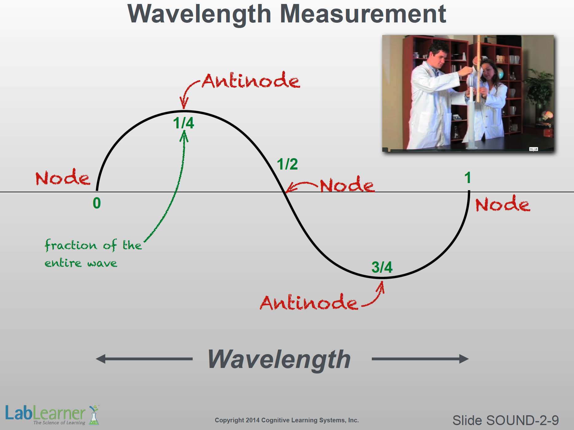 Note: This slide is included simply for the teacher’s use as a review for students prior to Investigation 2 Lab. It depicts a single wavelength and indicates that the antinode, node, antinode, node distances are measured in quarters.