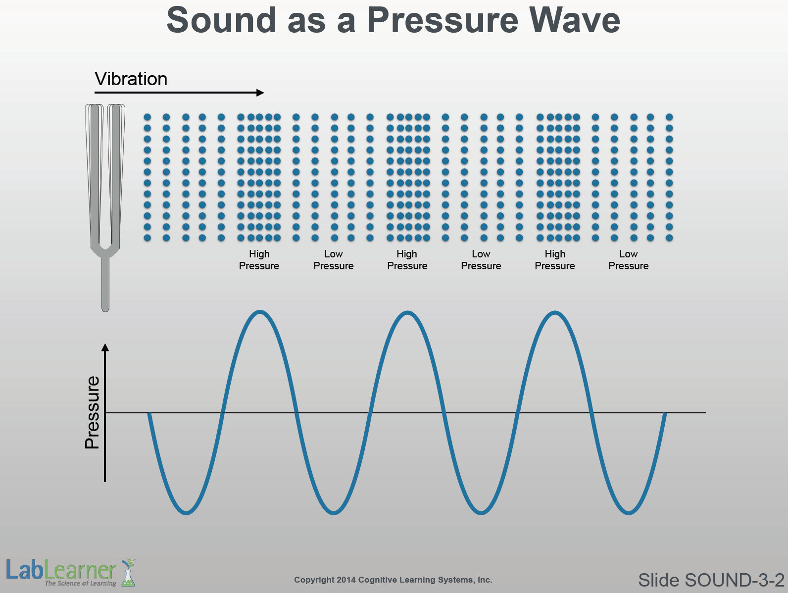 - On the lower half of the slide, the pressure wave from the vibrating air molecules above is represented as a typical sine wave. Notice that increasing pressure is in the upward direction. Each upward peak of the sine wave coincides with high pressure, while each peak below the centerline coincides with a low-pressure zone.