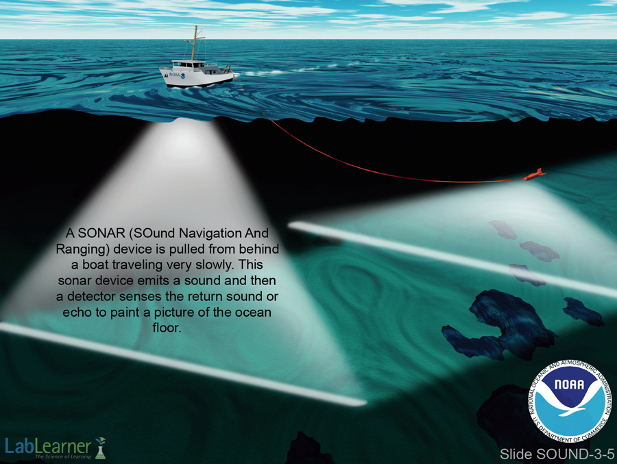 - This slide shows a sonar device being towed by a boat to chart the surface features of the ocean floor.