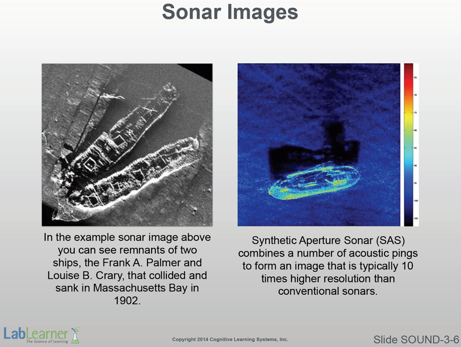 - This slide shows the detailed images that surface sonar can produce. Both of the pictures depict shipwrecks. The image on the right uses Synthetic Aperture Sonar, a process that can give augmented resolution to submerged objects.