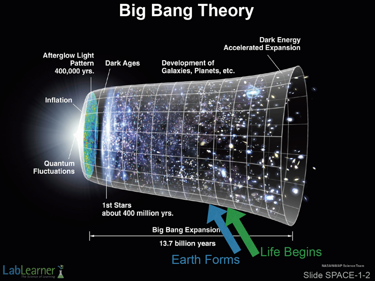 - In this slide, we introduce the Big Bang Theory. According to the theory, about 13.7 billion years ago all of the energy and matter that would eventually fill the Universe was concentrated into an extremely small point. At the time of the Big Bang, the intensely condensed energy exploded, creating both time and space.